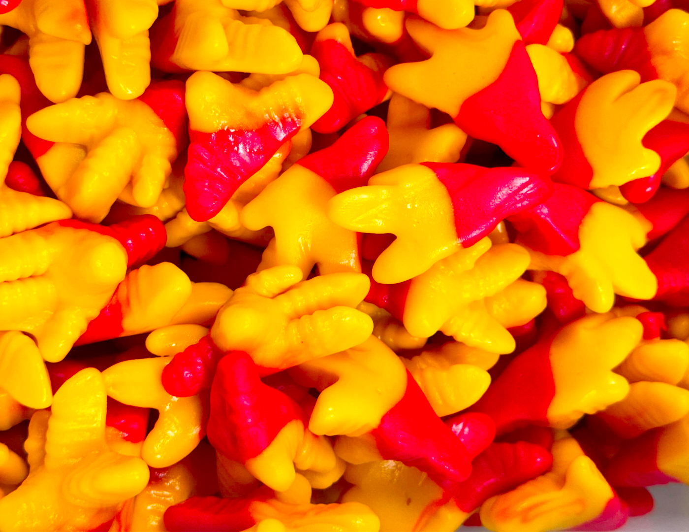Sugar, Glucose Syrup, Water, Gelatine, Acids (Citric Acid), Flavourings, Vegetable Oils (Palm), Glazing Agent (Carnauba Wax, Beeswax), Colours (E102, E129).