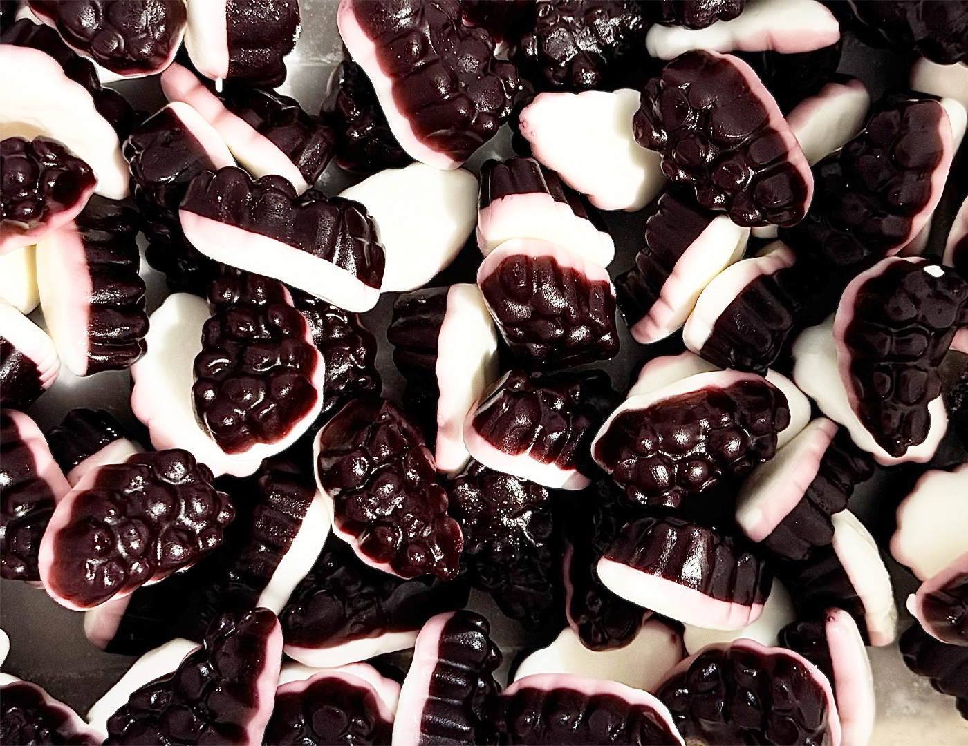 Glucose Syrup, Sugar, Modified Starch (Gluten-Free Wheat, Maize, Potato), Acids (Citric Acid, Lactic Acid), Flavouring, Fruit & Vegetable Concentrates (Black Carrot), Colours (E100, E141, E153, E160c), Glazing Agent (Carnauba Wax).
