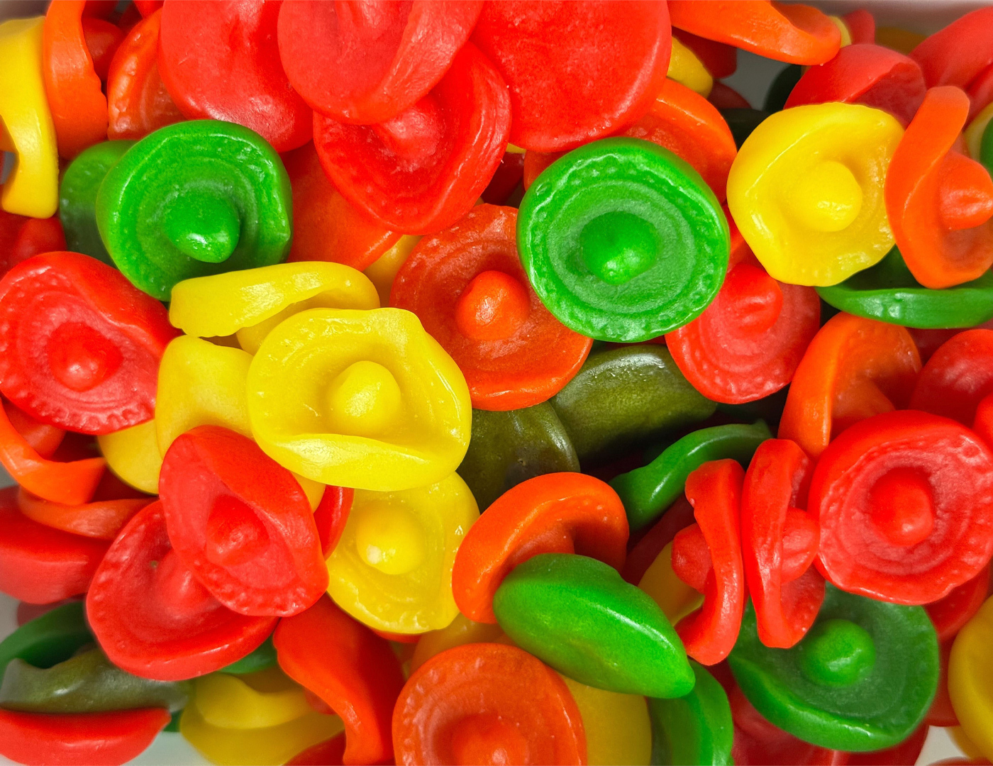 Sugar, Glucose Syrup, Wheat Starch, Water, Modified Maize Starch, Modified Potato Starch, Acids (Lactic Acid, Malic Acid, Citric Acid), Flavourings, Fruit and Vegetable Concentrates (Spirulina, Safflower, Black Carrot, Grape), Colours (Curcumin, Paprika Extract), Vegetable Oils (Coconut), Glazing Agent (Carnauba Wax).