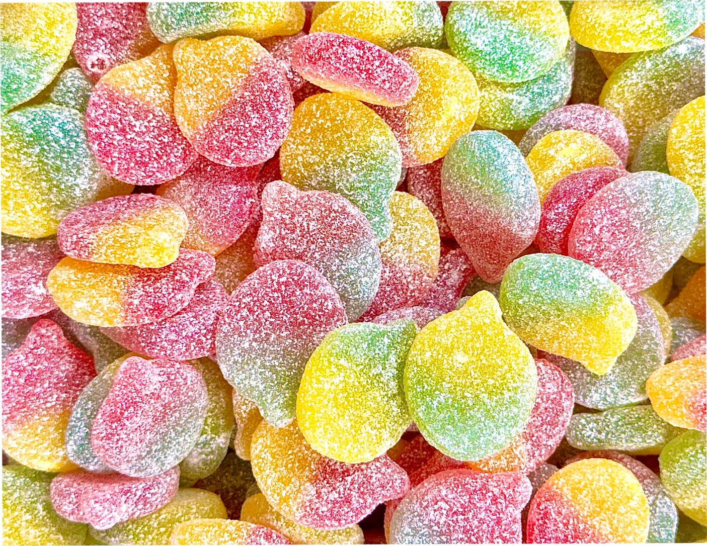 Sugar, Glucose Syrup, Water, Potato Modified Starch, Gelatine, Acidulants (E330, E296, E270), Flavours, Corn Starch, Colours (E102, E104, E110, E122, E124, E129, E133), Acidity Regulator (E350, E331), Gelling Agent (Pectins), Glazing Agent (Carnauba Wax), Vegetable Oil (Palm).