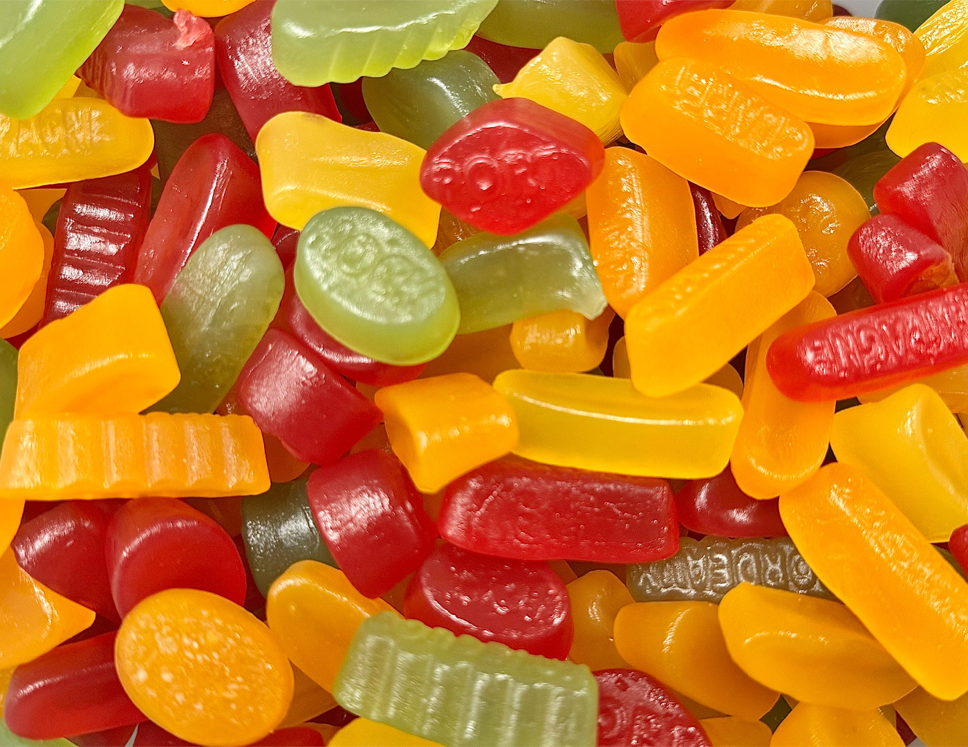 Glucose Syrup, Sugar, Modified Starch (Gluten-Free Wheat, Maize, Potato), Acids (Lactic Acid, Citric Acid), Flavouring, Colour (E150c), Glazing Agent (Carnauba Wax).
