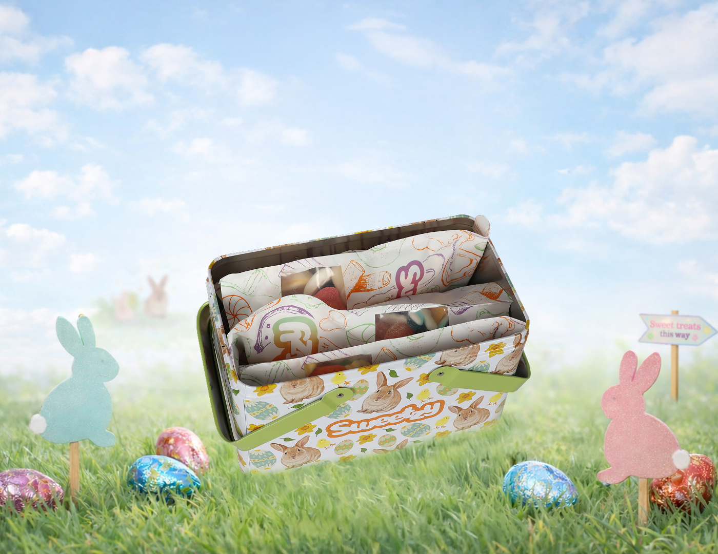 Each tin comes filled with custom Pick ’n’ Mix bag, plus two extra bags of Easter-inspired sweet mixes – ready to gift, share, and enjoy.