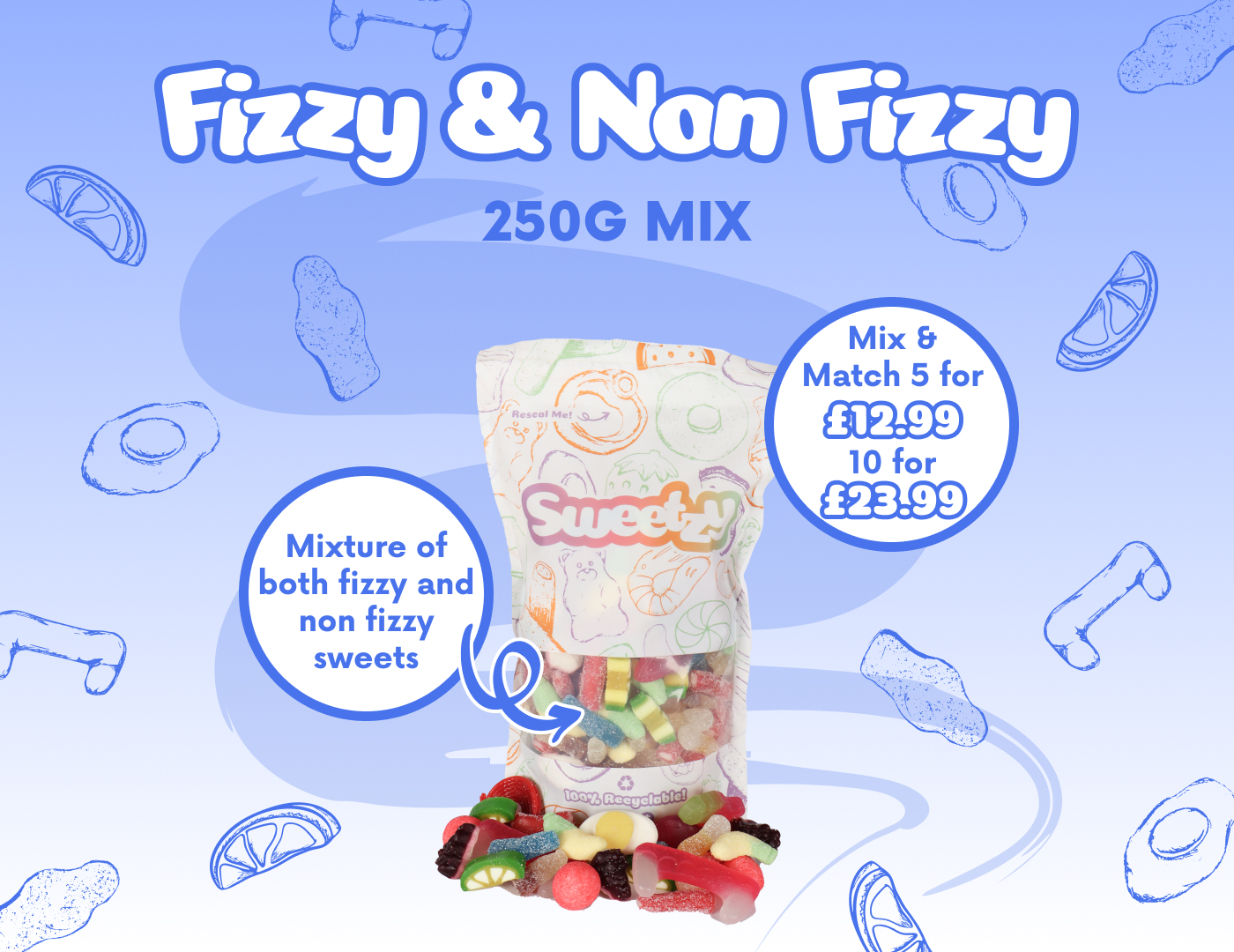 A mix of fizzy and non fizzy favourites — ideal if you like a bit of everything. It includes super-sour fizzy snakes, peelable sweets, classic strawberry wheels, and brand-new sugar-coated bananas. A great pick ’n’ mix if you want to try some of the best, all packed in a 100% recyclable, resealable pouch.