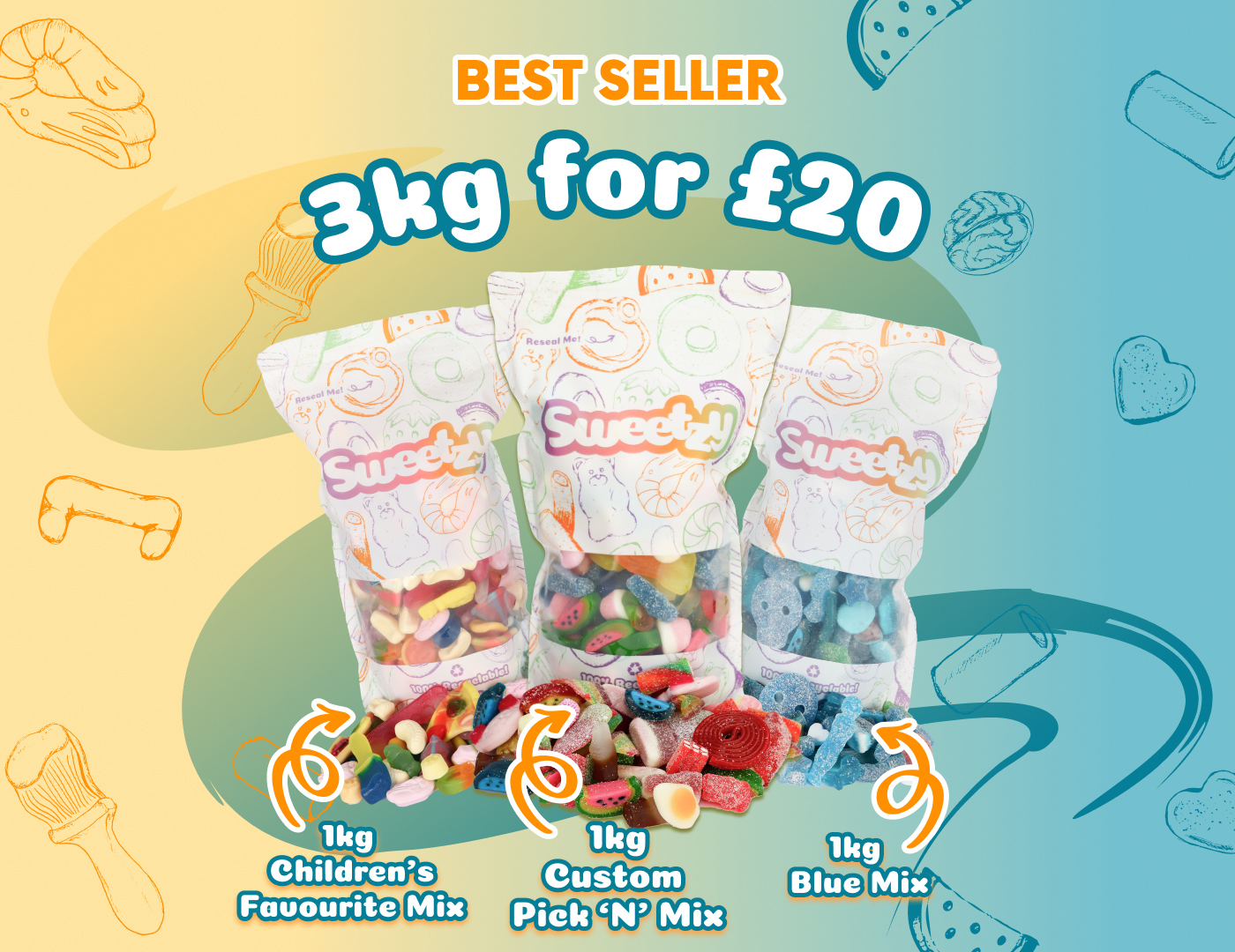 With this £20 bundle, you’ll get a huge 3kg of sweets, including two of our best-selling mixes. These are favourites for a reason—our customers keep coming back for them.