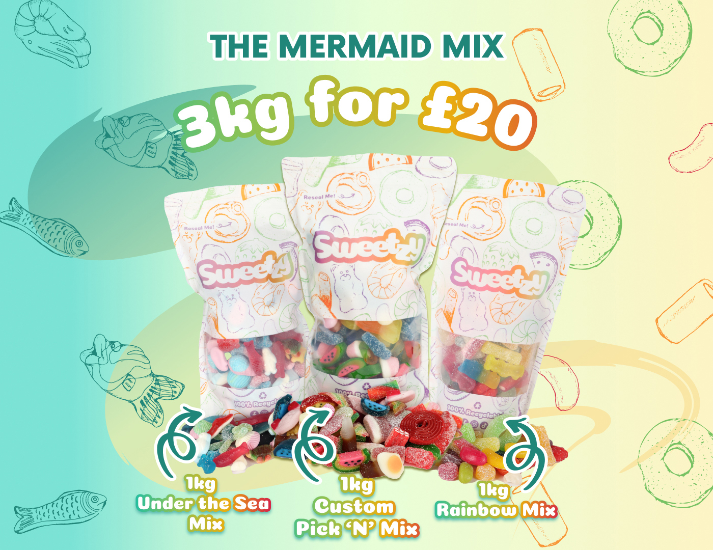 Looking for a fun, colourful bundle? This 3kg bundle for £20 includes our vibrant Rainbow Mix (with fizzy and non-fizzy sweets), our much-loved Under the Sea Mix (a mix of jelly-filled, fizzy and classic sweets), plus a fully customisable 1kg pick n mix just the way you like it.
